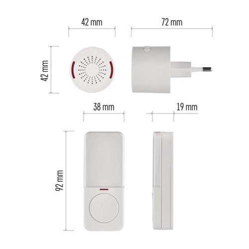 Minimalista konnektoros csengő. Akár 150 m-es hatótávolságú nyomógombbal. 10 választható rövid dallammal és 5 fokozatú hangerővel, akár 85 dB-ig. Nyomógomb fényjelzéssel, ami visszajelzést nyújt a csengő megfelelő működéséről. Nyomógomb tápellátása 1 db 3 V-os CR2032 elemről (a csomag tartalmazza). Átviteli frekvencia: 433 MHz. Vevőegység méretei: 72 x 42 x 42 mm, nyomógomb méretei: 19 x 38 x 92 mm. IP56-os védettségi fokozat: Részleges védelem a por behatolása ellen, védelem erős vízsugár ellen.