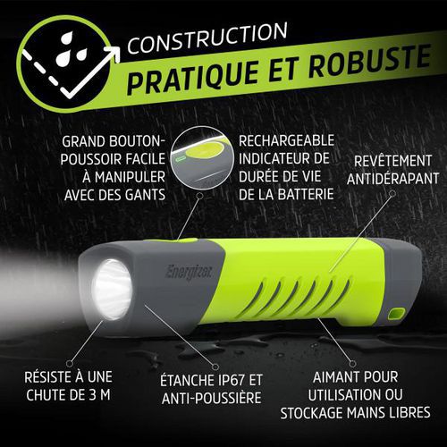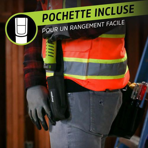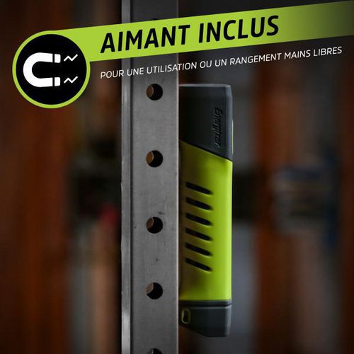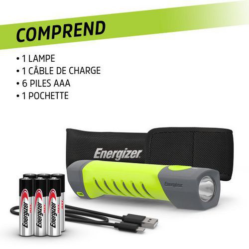 Energizer Pro sorozatú, magas CRI értékű zseblámpa tárolótokkal. Praktikus LED-es zseblámpa mágnessel a szabad kezekért munka közben. Tartalmaz egy tokot a lámpának, az elemeknek és a töltőkábelnek. 1000 lumen fényerő, kiváló színhűség a CRI-nek köszönhetően. Hibrid tápegység: újratölthető akkumulátor vagy 6× AAA elem. 4 világítási mód: erős, közepes, gyenge és stroboszkóp. Akár 20 órás akkumulátor-üzemidő alacsony energiafogyasztású módban (lítium-ion akkumulátorral). Kényelmes fogás a bordázott, csúszásmentes testnek köszönhetően. Praktikus nyomógombos kapcsoló a könnyű kezelhetőség érdekében, akár kesztyűben is.