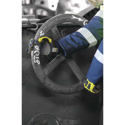 rugalmas megerősítés optimális védelmet nyújt a becsípődés és ütés ellen. Akár 44%-kal csökkenti az ütést, minimalizálja a csuklóproblémákat, és megvédi a kéztőcsontot akár 2 J erőtől. Körzsölés- és vágásállóság. 8 cm-es neoprén mandzsetta biztonságot és kényelmet biztosít. Tépőzáras tépőzár a jobb illeszkedésért. Kettős poliamid és poliuretán tenyér PVC pontokkal a csúszásmentes fogásért. Megerősítés a hüvelyk- és mutatóujj között, valamint a tenyéren. A jobb higiénia érdekében hideg vízben moshatók. Sárga szín a jobb láthatóság érdekében. Azonosító jelvény. Övcsipesz.