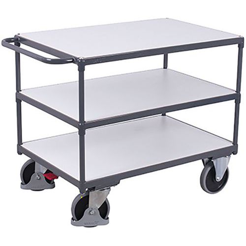 Antisztatikus polcos kocsi három polccal. Ágyfelület elektromosan vezető laminált forgácslapból. Síkba süllyeszthető polc fémkerettel. 2 fix és 2 forgó kerék EasySTOP fékkel. Szürke, nyommentes, termoplasztikus gumi kerekek műanyag felnin, precíziós golyóscsapágyakkal. Vázfelület-kezelés RAL skála szerinti porfestékkel. Ütés- és karcálló. Az EasySTOP központi fékrendszer mindkét forgó kereket bármilyen helyzetben rögzíti a pedál egyszerű megnyomásával. A pedál működtetéséhez nincs szükség munkavédelmi lábbelire vagy védőcipőre.