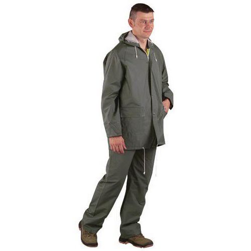 Vízálló kabát és nadrággarnitúra dupla bevonattal (pamut PVC és poliészter hátlap). A kabát hátulja szellőző, cipzárral záródik, pattintható viharlappal, alul húzózsinórral. Kapcsó gallérral : fix kapucni húzózsinórral. Ujj széldzseki összehúzással. Nadrág kapcsos rögzítéssel és húzózsinórral (rugalmas derékrész, pattintható a száron). Külső anyagvastagság: ,32 mm varrott és hegesztett varratok.