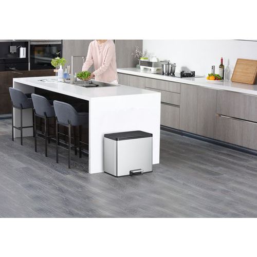 Téglalap alakú, csiszolt rozsdamentes acélból készült lépcsős szemetes, ujjlenyomat-mentes kivitelben, műanyag fedéllel. Lágyan záródó fedéllel és 3 béléssel (3x9 L) a szelektív válogatáshoz. A nyitva tartó funkció nyitva tartja a fedelet a könnyű tisztítás és zsákcsere érdekében.