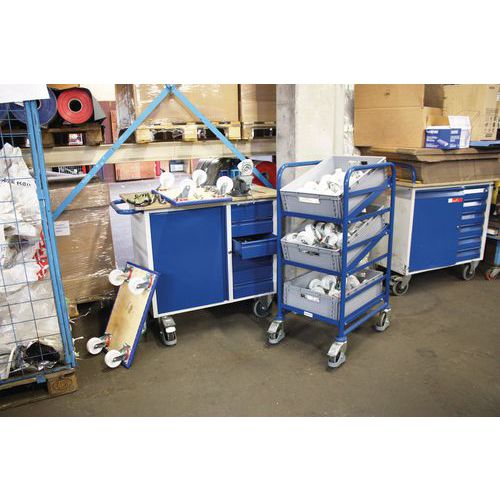 Kocsi három 600 x 400 mm-es műanyag ládával. A felső és középső polcok 17° vagy 32°-ban dönthetők, teherbírás polconként 50 kg. A keresztcsövek közötti távolság 125 mm. Furattávolság a polcok csavarozásához 150 mm. 4 forgókerék, melyek közül kettő fékkel van felszerelve. Szürke, nyommentes, termoplasztikus gumi kerekek műanyag felnin, precíziós golyóscsapágyakkal. Vázfelület-kezelés RAL skála szerinti porfestékkel. Ütés- és karcálló. Szerelés : Szereléshez Teherbírás (kg) : 200 kg
