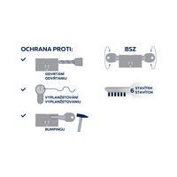 Biztonsági 6 állású zárbetét kifúrás ellen és roncsolásmentes dinamikus módszer (ún. bumping) ellen. RC3 biztonsági osztályban tanúsítva a ČSN EN 1627:2012 szabvány alapján. 2-es típusú NBÚ tanúsítvány, SS4=2 Behatoló kapcsoló = a betét nyitható betolt kulcs esetében is a másik oldalról. Kifúrás elleni védelem, 6 edzett acél elem, 5 csapszeggel és 1 csappal. Közös zár lehetőség - SU 40 000 valós kulcskombináció. Szabadon másolható kulcs.