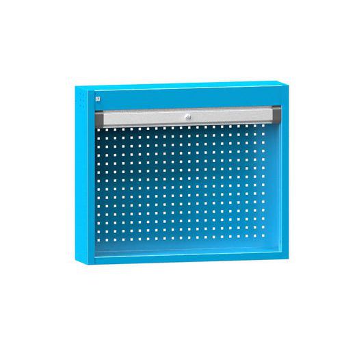 Fém szekrények falra szereléshez. Rugós tekercselésű, radiális zárral ellátott alumínium redőnnyel zárható. Perforált hátfal. Három színváltozatban kapható (kék, szürke, sötétkék). Terhelhetősége 35 kg.