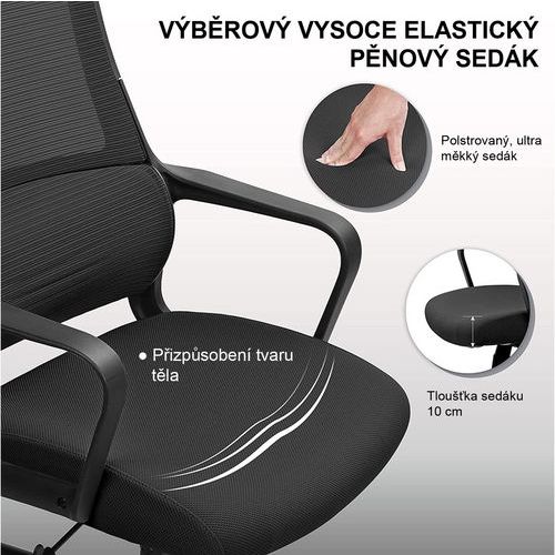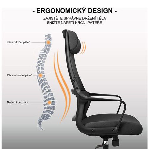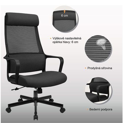 Faro irodai szék fekete hálós, légáteresztő, magas háttámlával. Puha, kényelmes, 10 cm vastag kárpitozott ülőlappal. 0-6 cm tartományban állítható magasságú fejtámlával. Állítható magasságú deréktámasszal. Alaphelyzetben rögzíthető hintamechanikával és állítható billentési ellentartással. A háttámla billentési szöge 90° és 115° között állítható. A szék 50 mm-es, kizárólag puha padlókhoz (pl. szőnyegekhez) alkalmas műanyag kerekekkel van felszerelve. Ötkarú acél fekete lábkereszt kellően széles alátámasztással a maximális stabilitás és oldaltartás érdekében. Alaptartozék a rögzített, beállítási lehetőségeket nélkülöző műanyag kartámasz. A karfa magassága a padlótól 64,5-71,5 cm. Otthoni irodába való, alkalmi számítógépes munkához ideális irodai szék. A szék teljes magassága 112,5-119,5 cm. A szövethuzat és a háló összetétele: 100% poliészter. Teherbírás (kg) : 120 kg Háttámasz