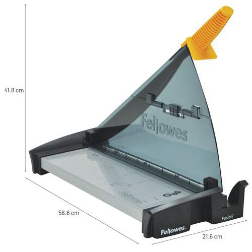 A Fellowes karos vágók könnyen használhatók a nagyon erős acélpengének és a praktikus nyélnek köszönhetően. A kézi papírszorító csökkenti a papír mozgását vágás közben. Ideális akár 10 oldal vágásához. A fém alapon található skála abszolút precíz vágást tesz lehetővé. Rendkívül stabil a csúszásgátló lábaknak köszönhetően. Maximális biztonság a kiegészítő széles vágási terület védelemnek köszönhetően.