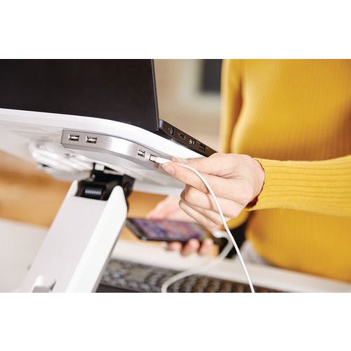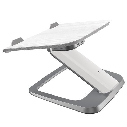 Ergonomikus laptopállvány egyszerű és kifinomult kialakítással. Festett alumínium alap, fa tetej. Egy kialakítás, amely segít csökkenteni a nyakfájdalmat és a szem megerőltetését. Rugalmas laptopállvány nagyon sima beállítással. Hátsó USB portok billentyűzet és egér csatlakoztatásához, ha szükséges. 2 USB port elektronikus eszközök töltéséhez.