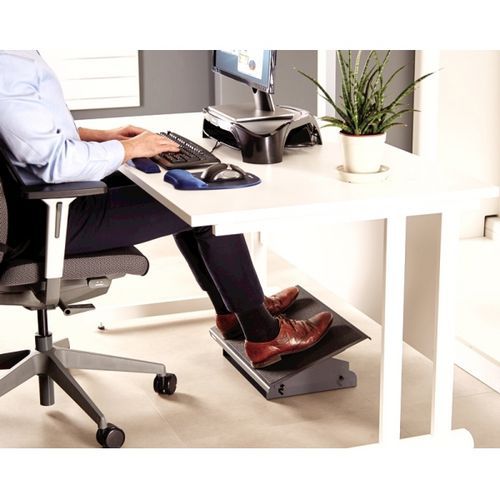 Lábtámasz az íróasztal melletti megfelelő és kényelmes üléshez. A helyes dőlésszög biztosítása révén megelőzi a végtagok merevségét és serkenti a lábak vérkeringését. Acél szerkezet és támaszlap. A csúszásmentes felület megakadályozza a lábak nem kívánt csúszkálását.