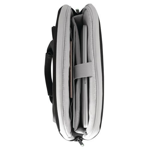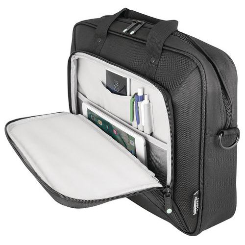 Laptoptáska dedikált rekesszel 10,5 hüvelykes táblagépek számára. Kényelmes és biztonságos, rögzítőpánttal a laptoptartó rekeszhez. Rekesze különféle tartozékok és dokumentumok számára. Laptoptáska kényelmes, megerősített fogantyúkkal.