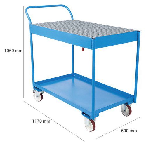 Fém kocsi felfogótálcával és polccal. A felfogótálcából egy csappal leereszthető a folyadék. Kivehető rács. 2 rögzített és 2 beálló fékezett 125 mm-es görgővel felszerelt. Poliamid görgők a zajcsökkentés érdekében. Az alsó 4 cm-es, megemelt peremű polc alkalmas a szállított anyag tárolására.