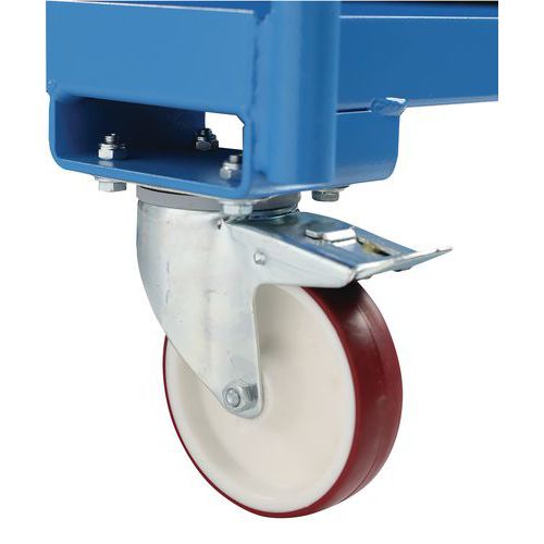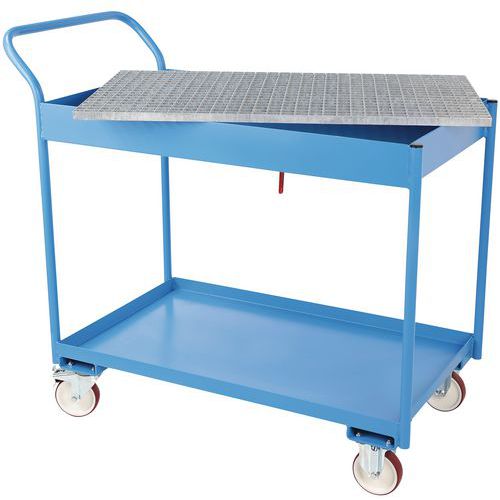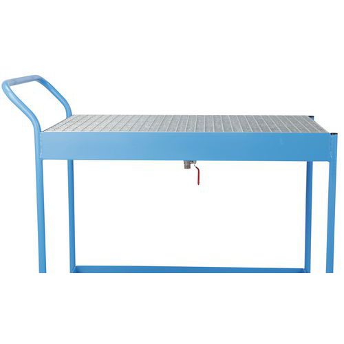 Fém kocsi felfogótálcával és polccal. A felfogótálcából egy csappal leereszthető a folyadék. Kivehető rács. 2 rögzített és 2 beálló fékezett 125 mm-es görgővel felszerelt. Poliamid görgők a zajcsökkentés érdekében. Az alsó 4 cm-es, megemelt peremű polc alkalmas a szállított anyag tárolására. Max. sztatikus terhelés (kg) : 300 kg