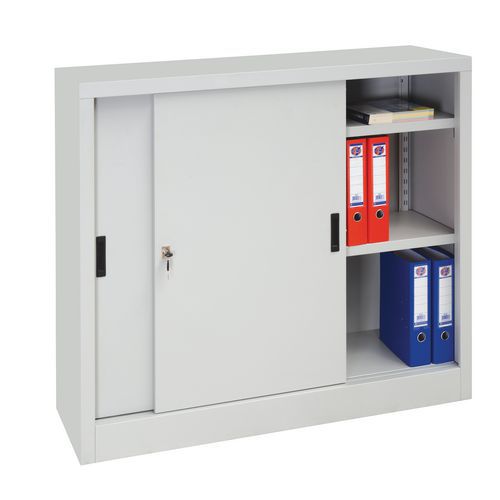 - Irattároló szekrény tolóajtóval Állítható magasságú polcok. Hengerzár, két kulcs. Krómozott fogantyúk és műanyag ütközők az ajtókon.