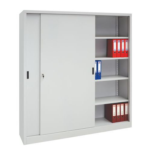 - Irattároló szekrény iratlefűzőkhöz, tolóajtóval. Állítható magasságú polcok. Hengerzár, két kulcs. Krómozott fogantyúk és műanyag ütközők az ajtókon.