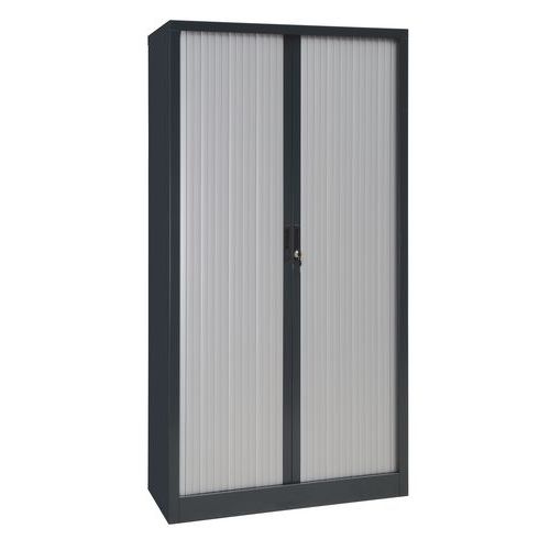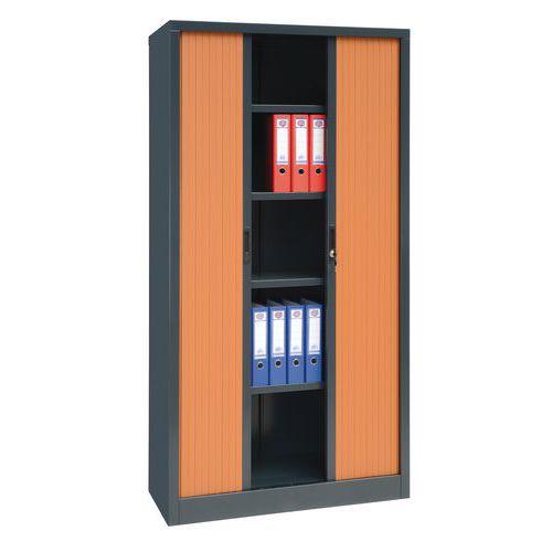 Szekrény rolóval különböző színváltozatban. Állítható magasságú polcok. Hengerzár, két kulcs. színe: antracit RAL 7016 ajtók színe: bükk, körte, ezüst, cseresznye méretek ma x szé x mé: 198 x 100 x 45 cm anyaga: acéllemez, vastagsága: 0,7 mm, műanyag roló polcok száma: 4 a polc teherbírása: 50 kg zár: hengerzár kivitel: rolóval a polcok 35 mm-es raszterben állíthatók, 2 kulcs, porszórásos felületkezelés, összeszerelt állapotban szállítjuk