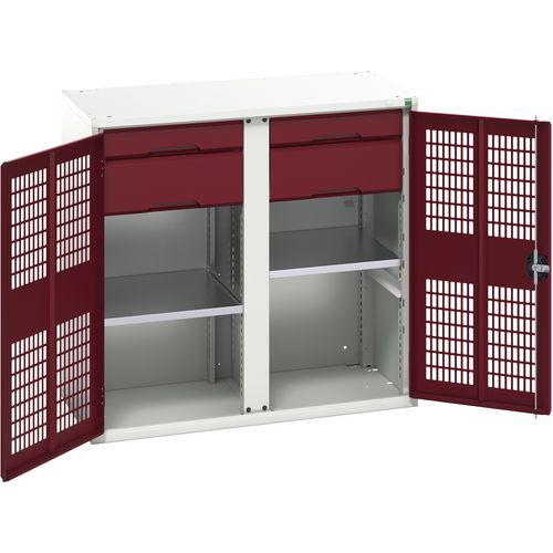 Bott Verso fém karbantartó szekrény, drótajtó, 100 x 105 x 55 cm, 2 polc, 4 fiók, szürke-piros Bott Verso fém karbantartó szekrény, drótajtó, 100 x 105 x 55 cm, 2 polc, 4 fiók, szürke-piros