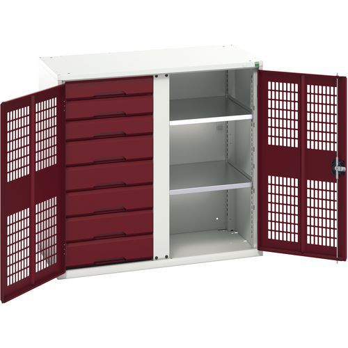 Bott Verso fém karbantartó szekrény, drótajtó, 100 x 105 x 55 cm, 2 polc, 8 fiók, szürke-piros Bott Verso fém karbantartó szekrény, drótajtó, 100 x 105 x 55 cm, 2 polc, 8 fiók, szürke-piros