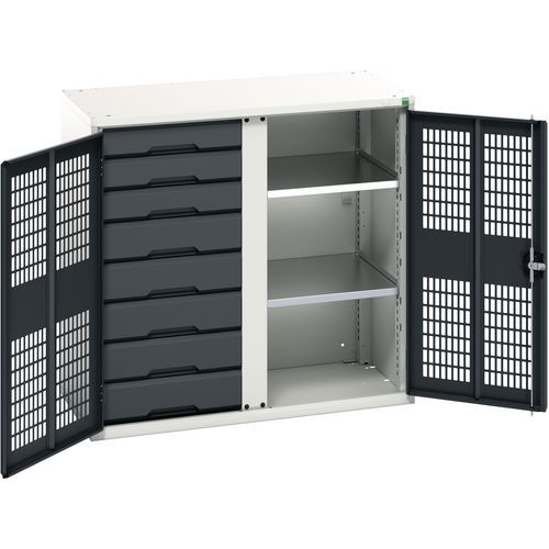 Bott Verso fém karbantartó szekrény, drótajtó, 100 x 105 x 55 cm, 2 polc, 8 fiók, szürke-antracit Bott Verso fém karbantartó szekrény, drótajtó, 100 x 105 x 55 cm, 2 polc, 8 fiók, szürke-antracit