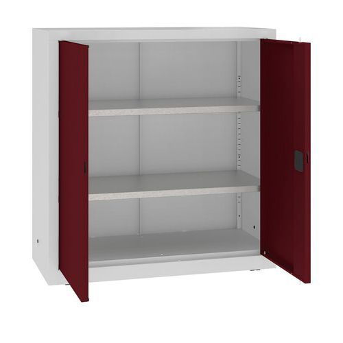 Fém műhelyszekrény, 104 x 100 x 43,5 cm, 2 polcos, szürke/sötét. piros Fém műhelyszekrény, 104 x 100 x 43,5 cm, 2 polcos, szürke/sötét. piros