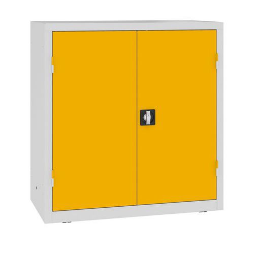 Alacsony fémszekrények két polccal és fiókkal, alkalmasak professzionális használatra beltéri száraz és szellőző helyiségekben. Monolit hegesztett acél szerkezet. 1 mm nagy szilárdságot biztosít. Lengőajtó RONIS hárompontos zárral (2 kulccsal szállítjuk). Belülről állítható szintező lábak. Csúszkák a szekrény könnyű mozgatásához és a padló védelméhez. A nagy biztonság érdekében a falhoz rögzíthető. Festés előtt a szekrényeket cirkónium réteggel vonják be, amely védi őket a korróziótól és növeli a festék tapadását. A szekrények a PN-EN 13501-1:2019-02 szabvány szerint A2-s1, d0 tűzvédelmi besorolással vannak bevonva. ISO:9001 és ISO:14001 szabványok szerint gyártva.