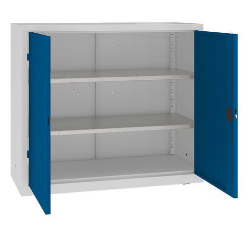 Alacsony fémszekrények két polccal, professzionális használatra alkalmas beltéri száraz és szellőző helyiségekben. Monolit hegesztett acél szerkezet. 1 mm nagy szilárdságot biztosít. Lengőajtó RONIS hárompontos zárral (2 kulccsal szállítjuk). Belülről állítható szintező lábak. Csúszkák a szekrény könnyű mozgatásához és a padló védelméhez. A nagy biztonság érdekében a falhoz rögzíthető. Festés előtt a szekrényeket cirkónium réteggel vonják be, amely védi őket a korróziótól és növeli a festék tapadását. A szekrények a PN-EN 13501-1:2019-02 szabvány szerint A2-s1, d0 tűzvédelmi besorolással vannak bevonva. ISO:9001 és ISO:14001 szabványok szerint gyártva. Max. polcterhelés (kg) : 100 kg Max. terhelés (kg) : 400 kg