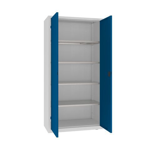 Magas fém szekrények négy polccal, alkalmasak professzionális használatra beltéri száraz és szellőző helyiségekben. Monolit hegesztett acél szerkezet. 1 mm nagy szilárdságot biztosít. Lengőajtó RONIS hárompontos zárral (2 kulccsal szállítjuk). Belülről állítható szintező lábak. Csúszkák a szekrény könnyű mozgatásához és a padló védelméhez. A nagy biztonság érdekében a falhoz rögzíthető. Festés előtt a szekrényeket cirkónium réteggel vonják be, amely védi őket a korróziótól és növeli a festék tapadását. A szekrények a PN-EN 13501-1:2019-02 szabvány szerint A2-s1, d0 tűzvédelmi besorolással vannak bevonva. ISO:9001 és ISO:14001 szabványok szerint gyártva.
