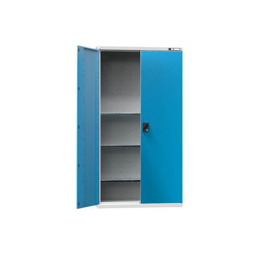 Fém műhelyszekrények nyíló ajtókkal és 180°-os nyitási szöggel. Stabil szerkezet acéllemezekből. Három állítható magasságú polcot tartalmaz 25 mm-es rácsban. A szekrényeket többek között az 54 x 27D méretű akasztóprogram és fiókok használatára tervezték. Az ajtó csendes, kétpontos zárrendszerű zárral zárható. Perforált panelek segítségével akasztható fel a függesztőprogram, a szekrény hátoldalára vagy oldalfalára szerelve. 3 színárnyalatban kapható. A szekrény teherbírása 600 kg. Max. terhelés (kg) : 600