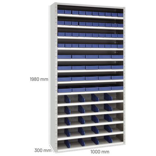 | Termék neve | Fém polcállvány osztókkal és boxokkal Manutan Expert, 198 x 100 x 30 cm, 12 polc |