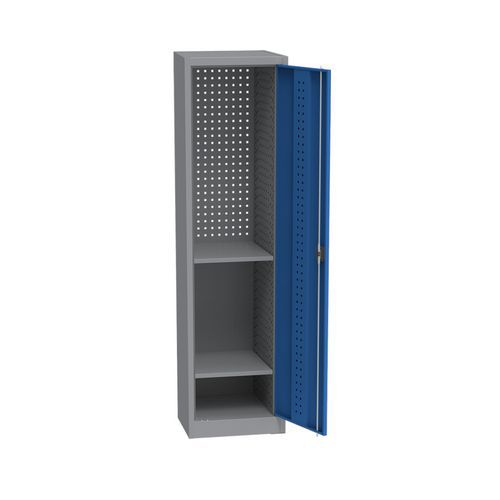 Hegesztett fém műhelyszekrények két polccal, üzemi területekre, autójavító műhelyekbe vagy laboratóriumokba. Perforált belső falak és ajtó a szerszámtartók elhelyezéséhez. 25 mm-es raszterben állítható polcok. 110°-os nyitási szöget biztosító ajtópántok. 0,7 mm vastagságú fémlemezből készült . A korpusz alja fém sarkakkal van megerősítve. Kétpontos ajtóreteszelés a szekrény felső és alsó részében hengerzár segítségével (a fő mesterkulcs szállítása lehetséges). Az EU-ban készült Max. terhelés (kg) : 400 kg Max. polcterhelés (kg) : 60 kg