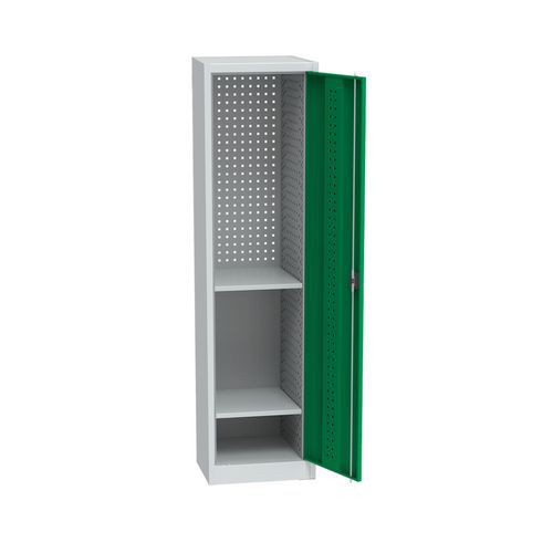 Hegesztett fém műhelyszekrények két polccal, üzemi területekre, autójavító műhelyekbe vagy laboratóriumokba. Perforált belső falak és ajtó a szerszámtartók elhelyezéséhez. 25 mm-es raszterben állítható polcok. 110°-os nyitási szöget biztosító ajtópántok. 0,7 mm vastagságú fémlemezből készült . A korpusz alja fém sarkakkal van megerősítve. Kétpontos ajtóreteszelés a szekrény felső és alsó részében hengerzár segítségével (a fő mesterkulcs szállítása lehetséges). Az EU-ban készült Max. terhelés (kg) : 400 kg Max. polcterhelés (kg) : 60 kg