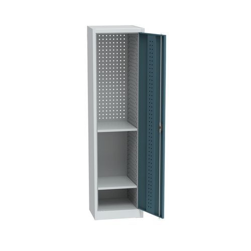 Hegesztett fém műhelyszekrények két polccal, üzemi területekre, autójavító műhelyekbe vagy laboratóriumokba. Perforált belső falak és ajtó a szerszámtartók elhelyezéséhez. 25 mm-es raszterben állítható polcok. 110°-os nyitási szöget biztosító ajtópántok. 0,7 mm vastagságú fémlemezből készült . A korpusz alja fém sarkakkal van megerősítve. Kétpontos ajtóreteszelés a szekrény felső és alsó részében hengerzár segítségével (a fő mesterkulcs szállítása lehetséges).
