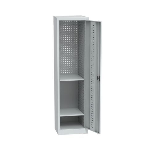 Hegesztett fém műhelyszekrények két polccal, üzemi területekre, autójavító műhelyekbe vagy laboratóriumokba. Perforált belső falak és ajtó a szerszámtartók elhelyezéséhez. 25 mm-es raszterben állítható polcok. 110°-os nyitási szöget biztosító ajtópántok. 0,7 mm vastagságú fémlemezből készült . A korpusz alja fém sarkakkal van megerősítve. Kétpontos ajtóreteszelés a szekrény felső és alsó részében hengerzár segítségével (a fő mesterkulcs szállítása lehetséges). Az EU-ban készült Max. terhelés (kg) : 400 kg Max. polcterhelés (kg) : 60 kg