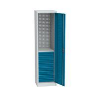 Hegesztett fém műhelyszekrények polccal és nyolc fiókkal, üzemi területekre, autójavító műhelyekbe vagy laboratóriumokba. Perforált belső falak és ajtó a szerszámtartók elhelyezéséhez. Nyolc db 10 x 38,2 x 46 cm méretű fiók, teljes kitolású teleszkópos golyós vezetősínnel. 50 mm-es lépésközben állítható fiókok, 25 mm-es lépésközben állítható polcok. 110°-os nyitási szöget biztosító ajtópántok. 0,7 mm vastagságú fémlemezből készült . A korpusz alja fém sarkakkal van megerősítve. Kétpontos ajtóreteszelés a szekrény felső és alsó részében hengerzár segítségével (a fő mesterkulcs szállítása lehetséges).