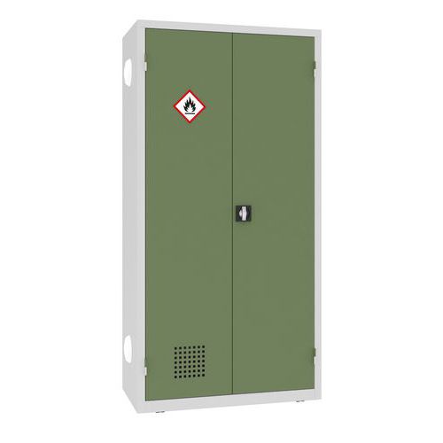 A lengőajtók szellőzőnyílásokkal rendelkeznek a levegő keringtetése érdekében, és GHS-02 címkével vannak ellátva a szabványos vegyi veszélyek azonosításához.