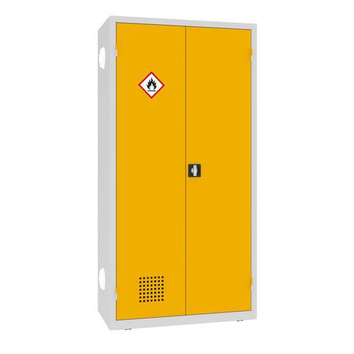 A lengőajtók szellőzőnyílásokkal rendelkeznek a levegő keringtetése érdekében, és GHS-02 címkével vannak ellátva a szabványos vegyi veszélyek azonosításához.