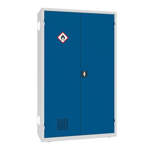 A lengőajtók szellőzőnyílásokkal rendelkeznek a levegő keringtetése érdekében, és GHS-02 címkével vannak ellátva a szabványos vegyi veszélyek azonosításához.