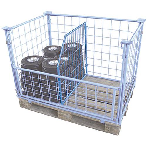 Hálós válaszfal 64-es típusú raklapbővítőkhöz. Szembőség 100 x 100 mm. Vázfelület-kezelés RAL skála szerinti porfestékkel. Ütés- és karcálló.
