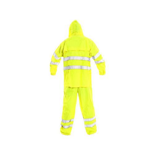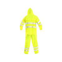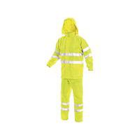 Figyelmeztető ruha, vízálló, ragasztott varrás, kapucni gallérban, nadrág gumírozott derékban, praktikus csomagolásban. Méret: L-XXXL Felosztás: Férfi szabványok: EN 471+A1, EN 343+A1 Anyagösszetétel: 100% poliészter Oxford PU impregnálással Szín: sárga