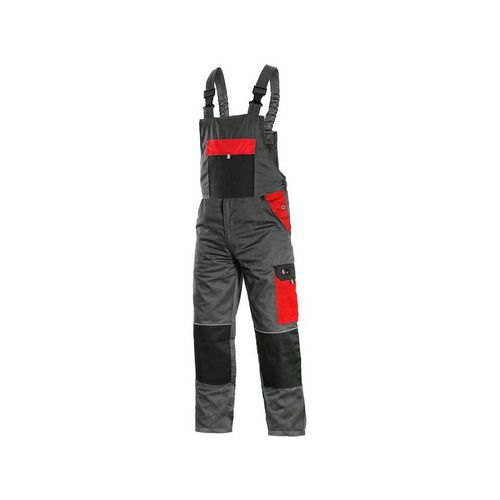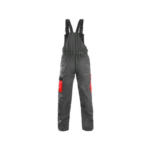 Férfi nadrág vállpánttal, elülső zsebekkel, mérőszalag zsebbel, oldalsó füles zsebbel, hátsó egy zsebbel, derékkal övhurokkal, vállpántos zsebbel. Méret: 46-64 Szabványok: EN ISO 13688 Öltönykollekció: CXS PHOENIX Anyagösszetétel: 65% poliészter, 35% pamut, 190 gsm Szín: szürkés-piros