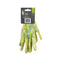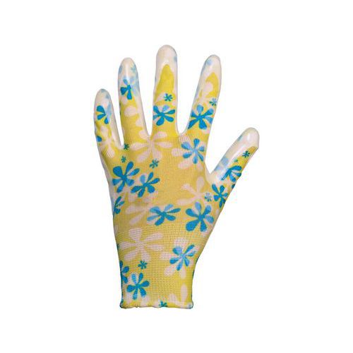 Nyomtatott kesztyű, nitrilbe mártott tenyér és ujjak. Felhasználási javaslat: kert, hobbi. Méret: 7, 8 Szabványok: EN 420 Anyagösszetétel: nylon varrat nélküli kötött