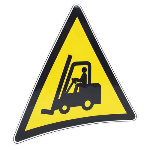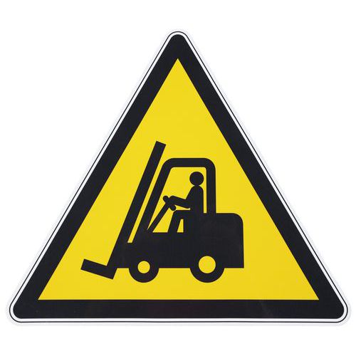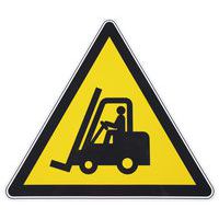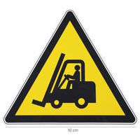Figyelmeztető táblák, amelyek jelzik az ipari járművek, például targoncák vagy szállítóberendezések mozgása által okozott veszélyeket.