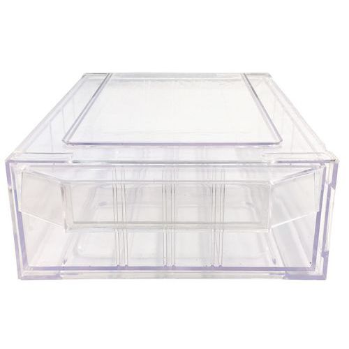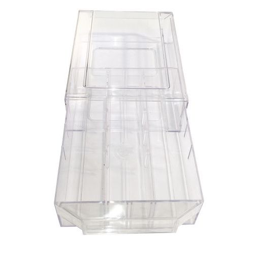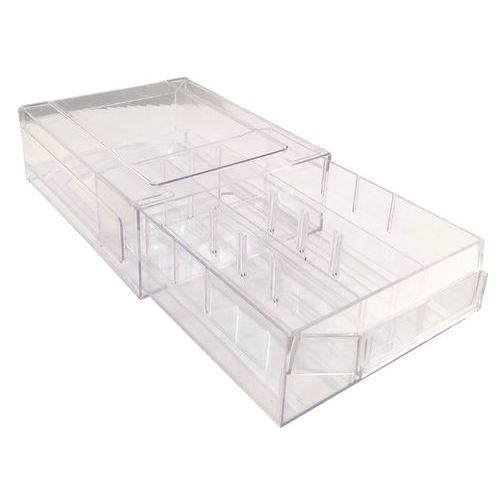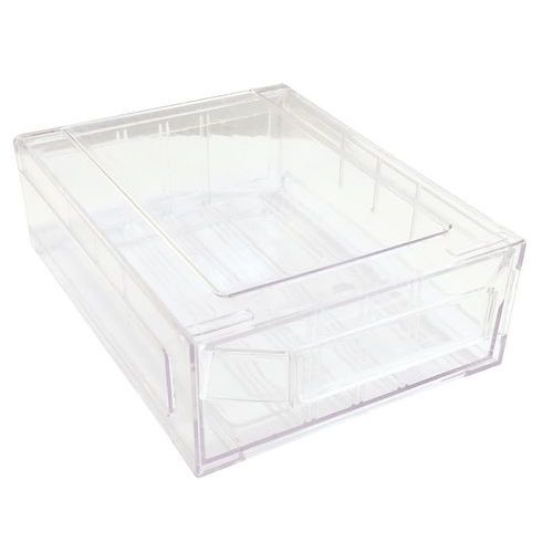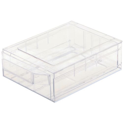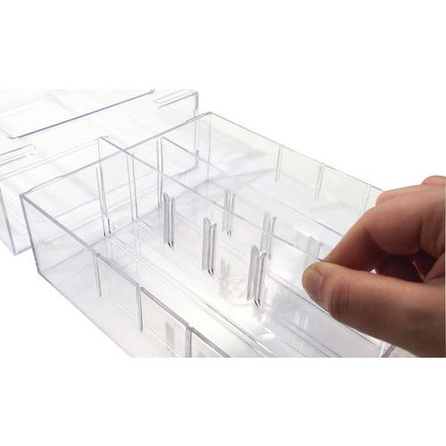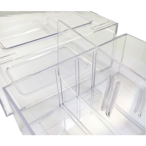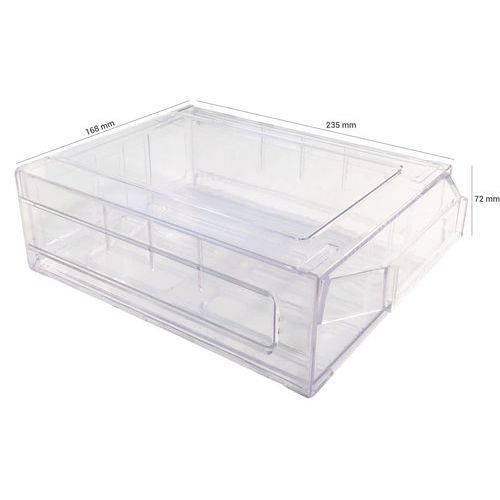 100%-ban átlátszó a teljes láthatóság érdekében. A szabadalmaztatott rendszernek köszönhetően a fiókos egységek összekötő anyagok és szerszámok használata nélkül csatlakoztathatók. Beépített címketartó a fogantyúban. Gyártói garancia az ügyfélnek : 3 év