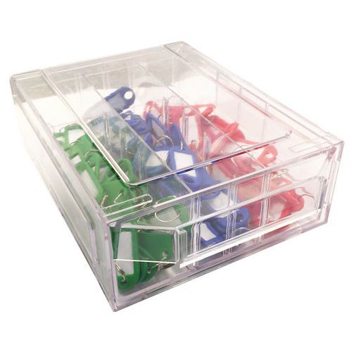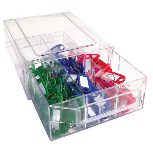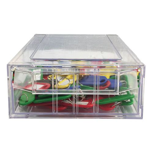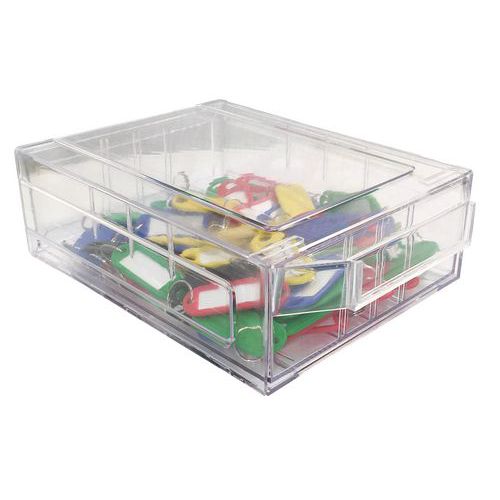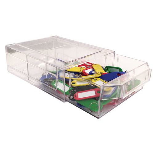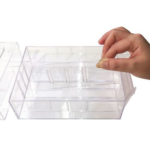 100%-ban átlátszó a teljes láthatóság érdekében. A szabadalmaztatott rendszernek köszönhetően a fiókos egységek összekötő anyagok és szerszámok használata nélkül csatlakoztathatók. Beépített címketartó a fogantyúban.