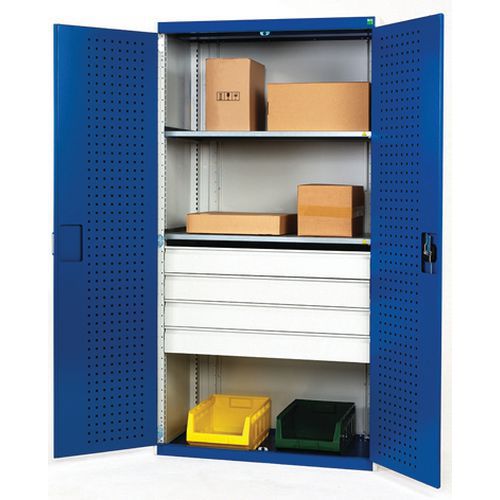 160 kg teherbírású polcokkal és fiókokkal felszerelt fém műhelyszekrények a hatékony üzemi és műhelyi felhasználás érdekében. Magas hegesztett acélszerkezet 1,5 tonna teherbírásig, porszórt bevonattal. Megerősített szárnyas ajtók perforált belső oldallal szerszámok tárolására. . Hárompontos hengeres tengelytávzár két kulccsal. 25 mm-es lépésekben állítható magasságú horganyzott polcok. 75 kg-os teherbírású, görgős csapágyakon 100%-ban kihúzható fiókok.