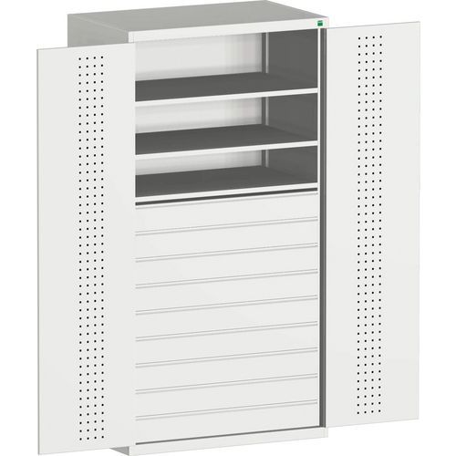 160 kg teherbírású polcokkal és fiókokkal felszerelt fém műhelyszekrények a hatékony üzemi és műhelyi felhasználás érdekében. Magas hegesztett acélszerkezet 1,5 tonna teherbírásig, porszórt bevonattal. Megerősített szárnyas ajtók perforált belső oldallal szerszámok tárolására. . Hárompontos hengeres tengelytávzár két kulccsal. 25 mm-es lépésekben állítható magasságú horganyzott polcok. 75 kg-os teherbírású, görgős csapágyakon 100%-ban kihúzható fiókok.