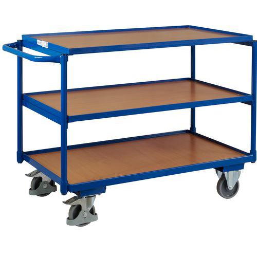 Raktári anyagok és tárgyak szállítására alkalmas három polcos polcos kocsik. A kocsi fémkeretébe MDF lapból készült polcok kerültek. A mozgást négy gördülő golyóscsapágyas kerék biztosítja, melyek közül kettő fix, kettő pedig Easy Stop fékekkel és védőburkolatokkal forgatható. Keret felületkezelés porfestékkel RAL skála szerint. Nem elkenődésmentes, hőre lágyuló gumi kerekek műanyag peremen, golyóscsapágyakkal, összegabalyodás- és lábvédővel. Az EasySTOP központi fékrendszer a pedál egyszerű megnyomásával bármely helyzetben rögzíti mindkét forgó kereket. A pedál működtetéséhez nincs szükség munka- vagy biztonsági lábbelire.