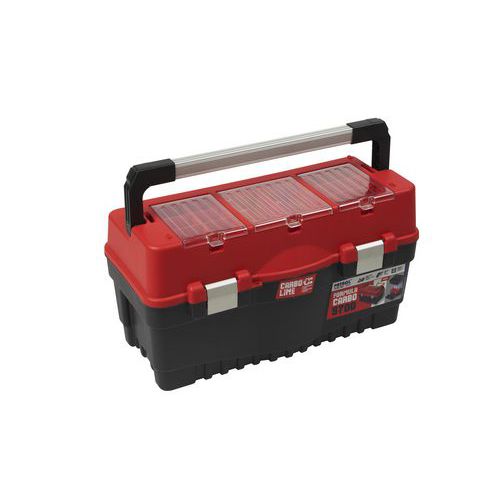Szerszámos kofferek ellenálló műanyagból, alumínium fogantyúval. A felső rekeszek áttetsző polikarbonáttal vannak lefedve. Belső kivehető tál rekeszekkel a kisebb szerszámokra. Alumínium klipszek és függőlakattal való lezárási lehetőség. anyaga: műanyag, polikarbonát színe: fekete, piros