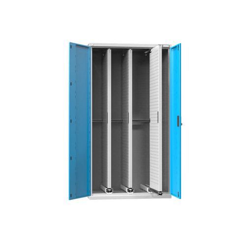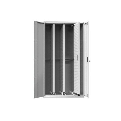A kihúzható perforált panelekkel ellátott függőleges szekrények zárral vannak rögzítve, ahol az egyik perforált panel kihúzásakor a központi zár biztonsági mechanizmusa reteszeli az összes többi perforált panelt. Ez megakadályozza a szekrény előrebillenését.