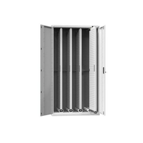 A kihúzható perforált panelekkel ellátott függőleges szekrények zárral vannak rögzítve, ahol az egyik perforált panel kihúzásakor a központi zár biztonsági mechanizmusa reteszeli az összes többi perforált panelt. Ez megakadályozza a szekrény előrebillenését.