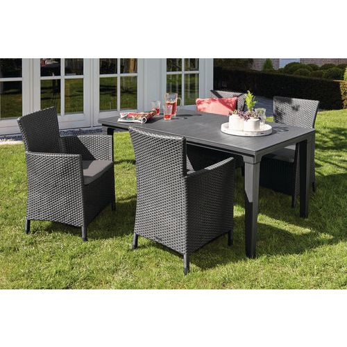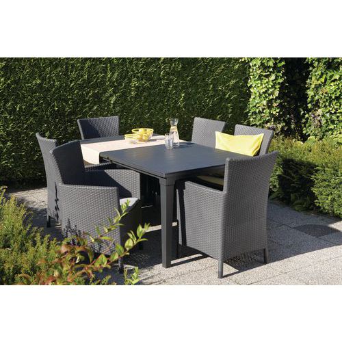 Műanyag asztal a teraszon, pergolán vagy a kertben való szabadtéri ülőalkalmatossághoz. A sokoldalú, mégis modern megjelenés garantálja az univerzális felhasználást. Időjárásálló és ellenáll a mechanikai sérüléseknek. Könnyen összeszerelhető és karbantartható
